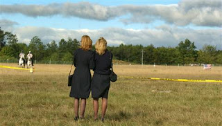 Two United flight attendants look to the actual crash site just before the start of the memorial service at the temporary memorial to Flight 93 near Shanksville, Pa., on Sept. 11, 2002.