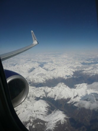 I was looking out the window at the Swiss Alps. “In the backpack,” I mumbled.