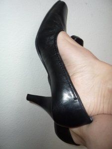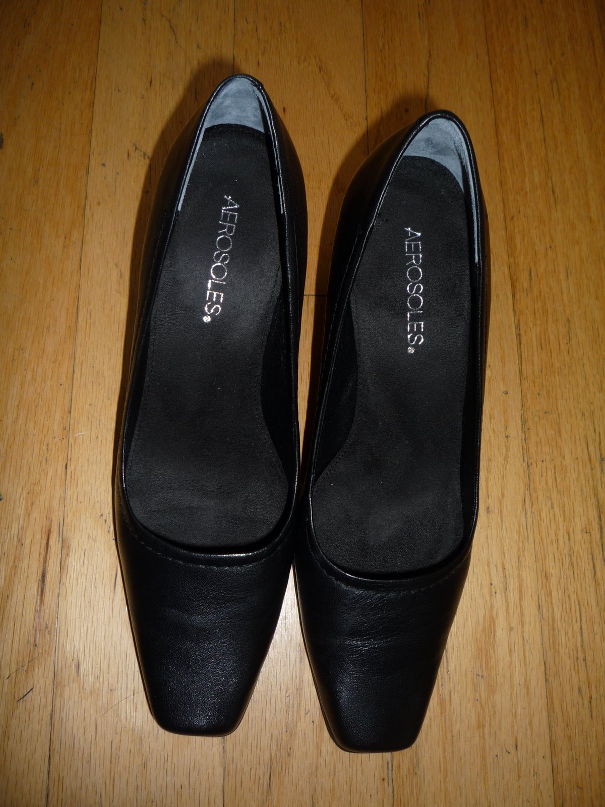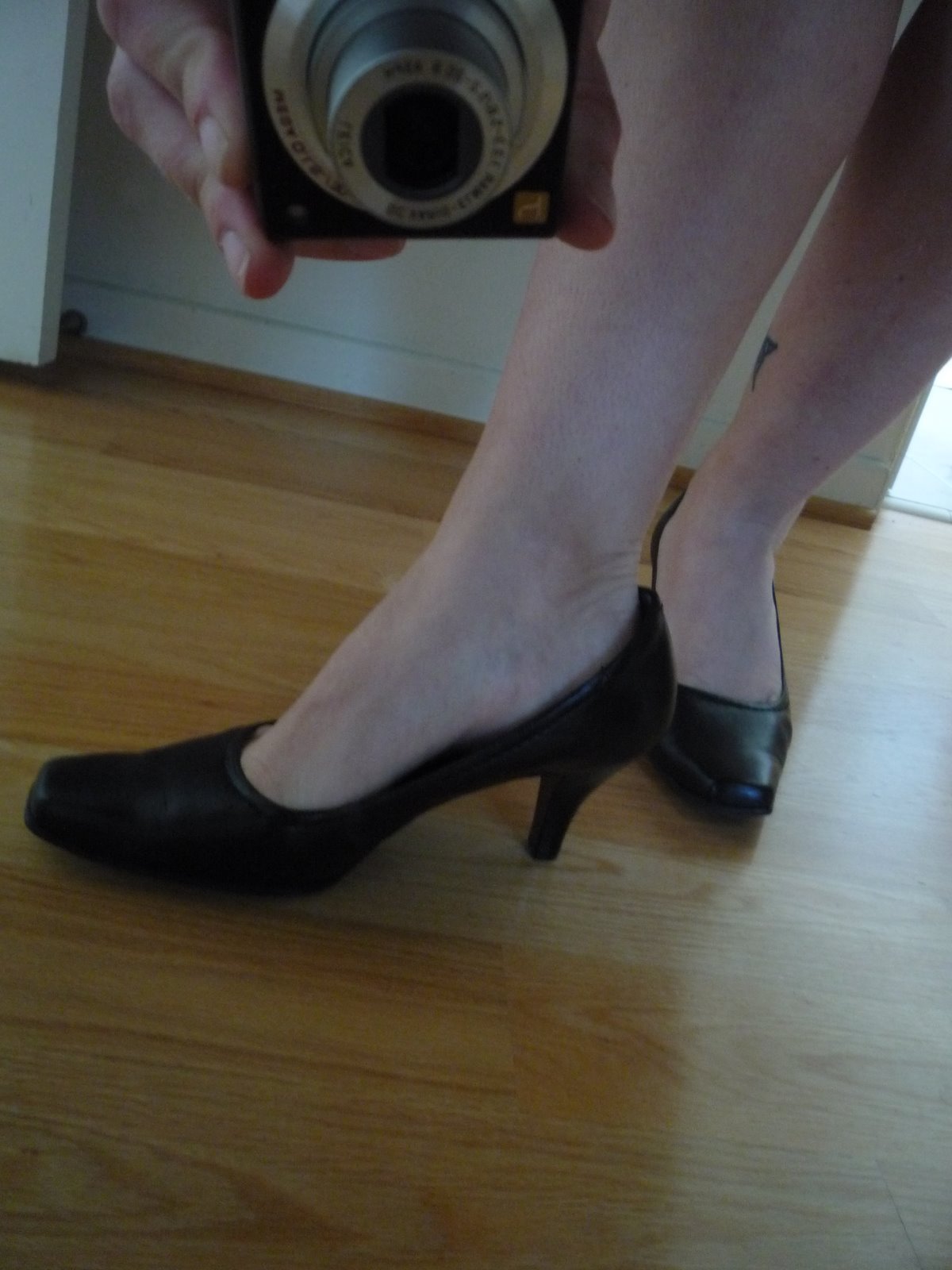 No stilettos, minimum heel size at base of an AUD$2 coin, black, no straps, no buckles, no trims etc etc etc.