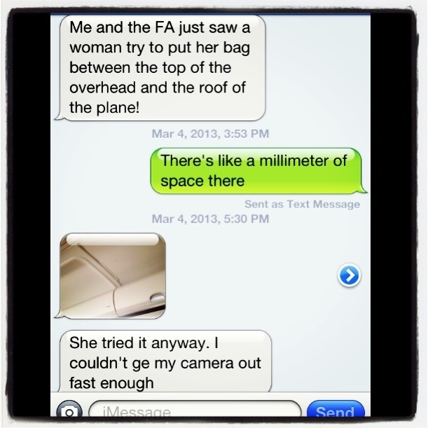 I get texts, funny texts, about overhead bins and luggage and stuff…