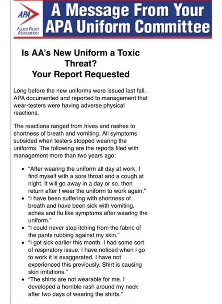 There’s a reason a uniform looks good and lasts for years. Because of the chemicals it’s been treated with. Mr. Isom and Mr. Parker know this. They know full well we are not having reactions to retail clothing, we’re having reactions to the uniform. Whenever management brings up thousands of passengers wearing COMMERCIAL clothing on our planes, know this is their way of tricking people into believing there’s nothing they can do about our situation since they can’t control what passengers wear. They’re trying to make people think it’s us that’s the problem and therefore out of their hands.