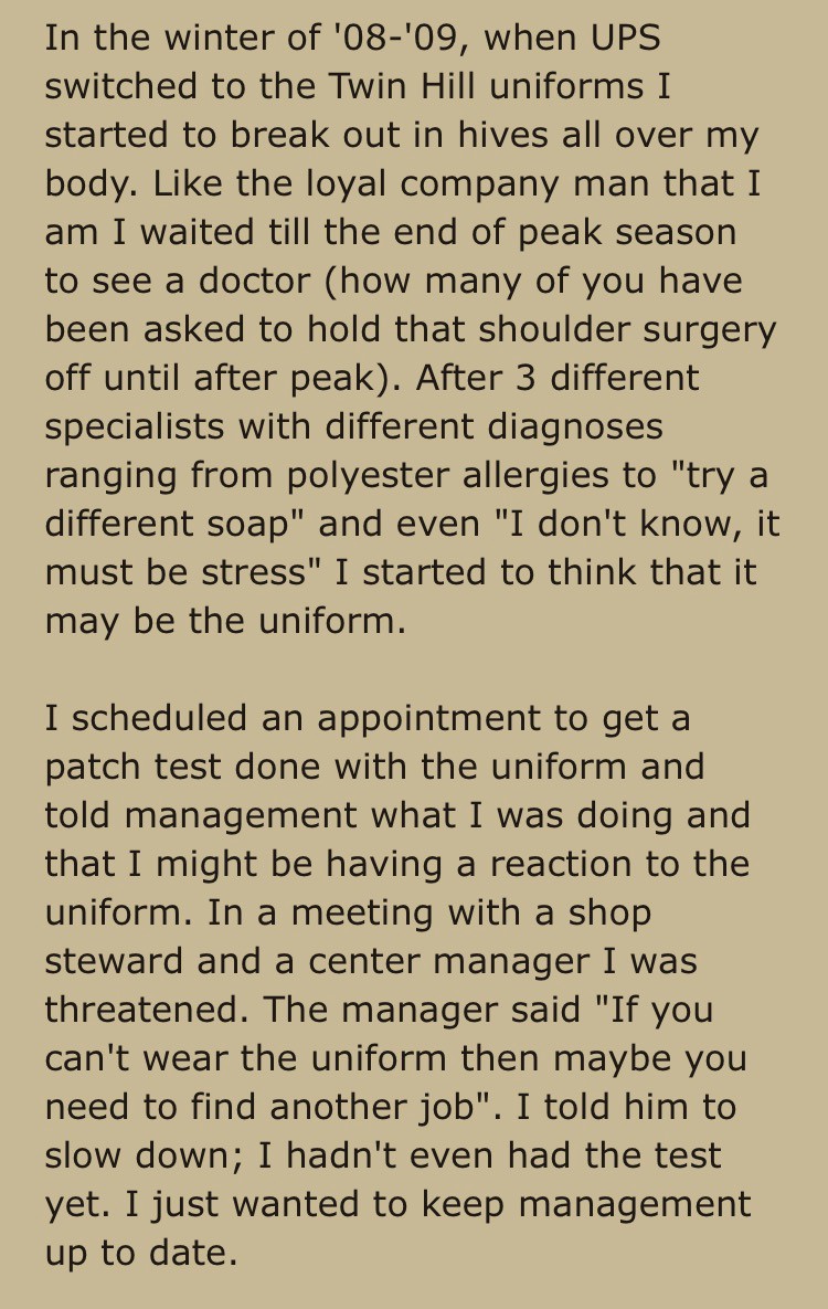 In wrapping things up Mr. Isom stated, “introducing something new can create issues.” This is true. Except we aren’t just talking about any issue, we’re talking about health issues. We’re talking about thousands of sick employees. We’re also talking about workers comp cases that have been denied. Our reactions are classified as allergies, and allergies are considered personal, not work-related, even though we are required to wear a uniform to work. In other words, we’re talking about people having a safe place to work.